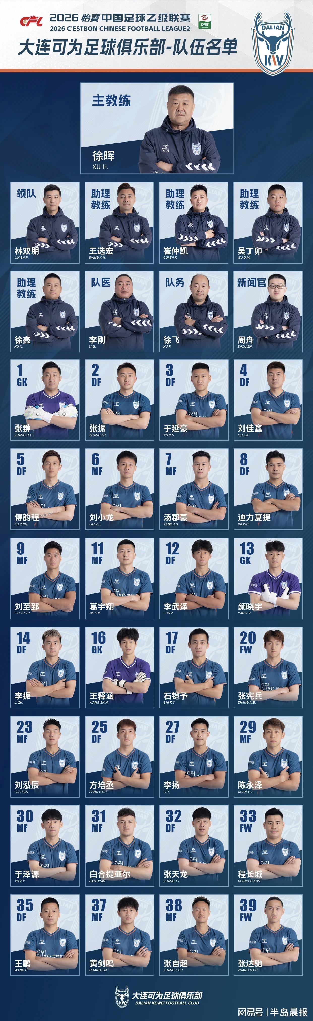 大连可为名单公布 张翀领衔 xiaoqiao 2026年03月20日 06:05 13 0 大连可为俱乐部16日公布了新赛季名单,老将张翀领衔,28名球员亮相。王选宏、崔仲凯、吴丁卯加盟教练组。21日,大连可为将迎来中乙首战,对阵山西崇德荣海。半岛晨报、39度视频记者隋海涛